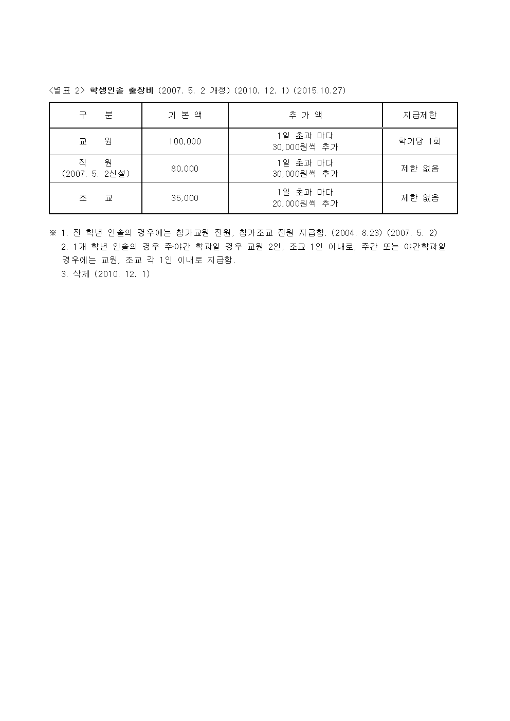 별표 2 학생인솔 출장비 (2007. 5. 2 개정) (2010. 12. 1) (2015..hwp